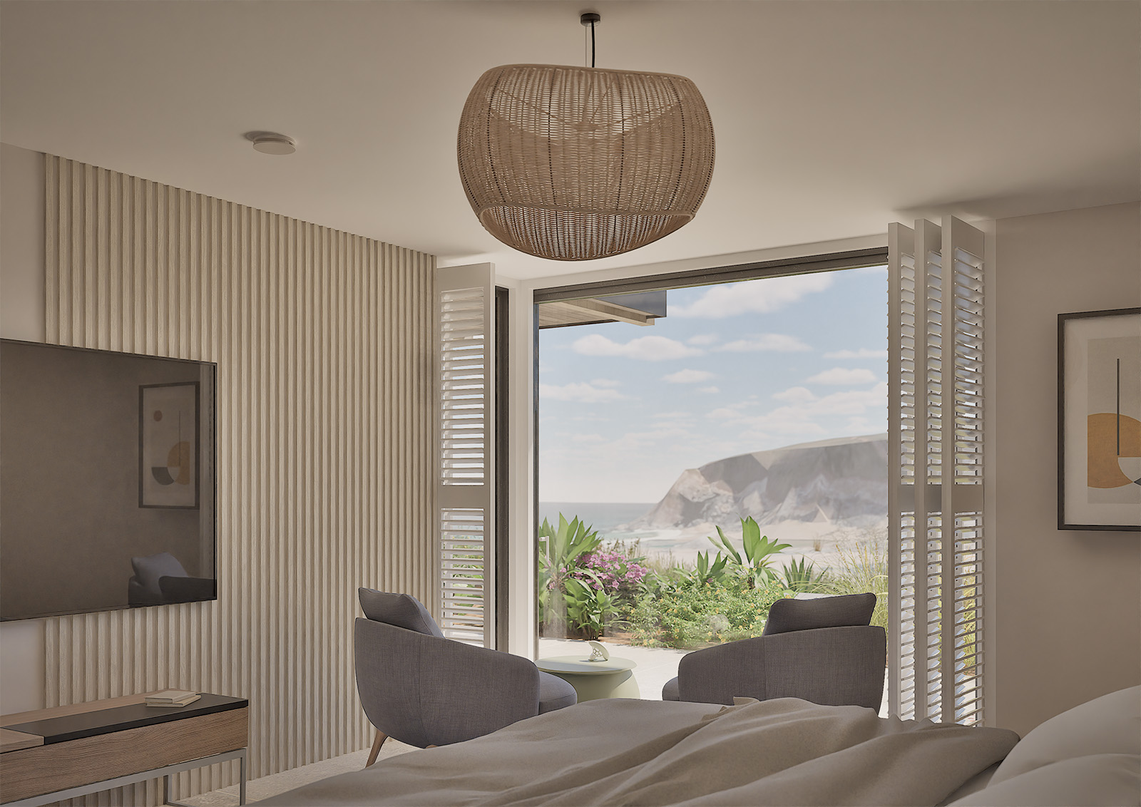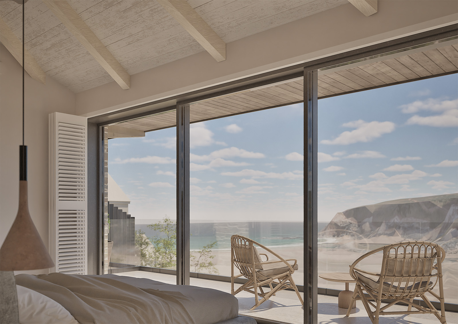 The compact form is articulated into three volumes to reduce visual bulk and respect neighbouring rooflines. Carefully placed north‑facing glazing maximises far‑reaching sea views while overhangs, recessed fenestration and the choice of recessive materials ensure the design integrates sensitively into its coastal context.