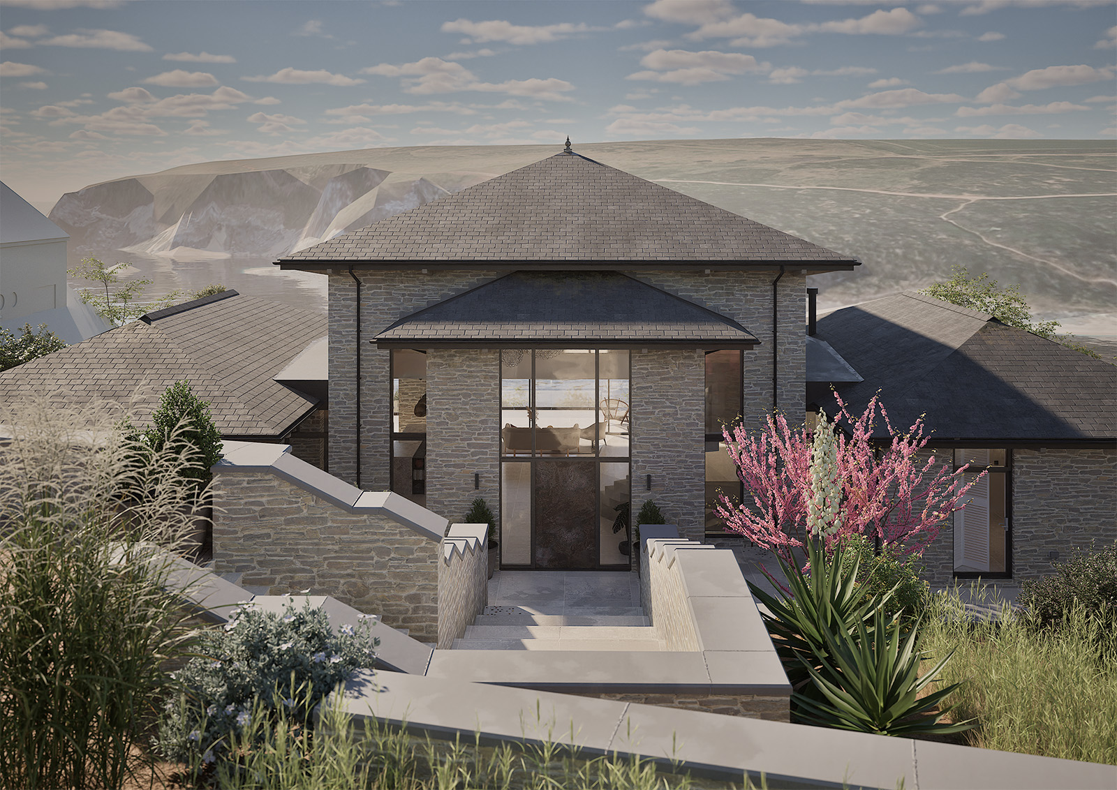 Long Cove replaces a 1940s brick bungalow for a family of wildlife filmmakers, offering a new-build home that honours the natural setting of Porthcothan AONB. The brief was to create a high-performance, sustainable home, inspired by traditional Cornish stone and slate, with enhanced biodiversity and energy efficiency.