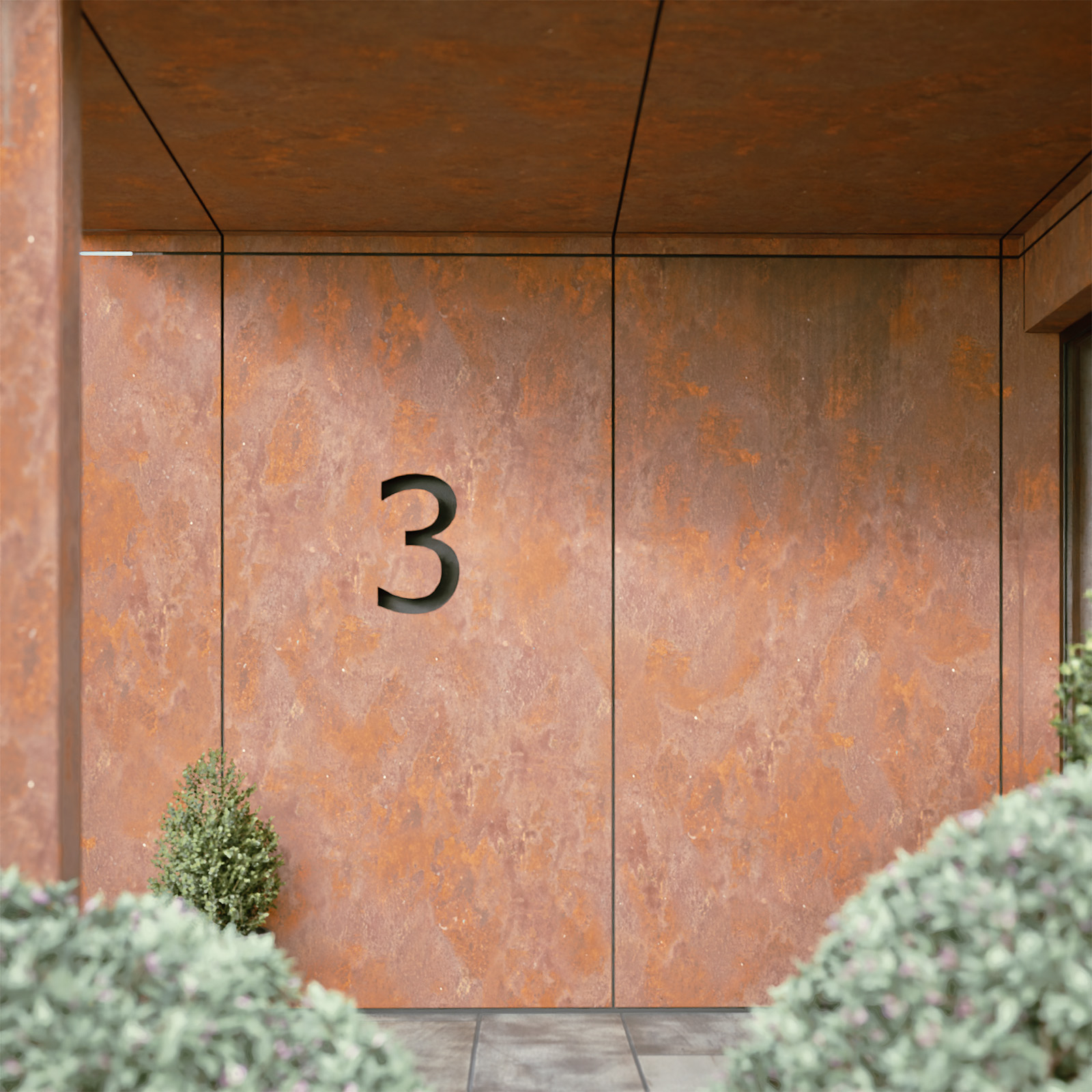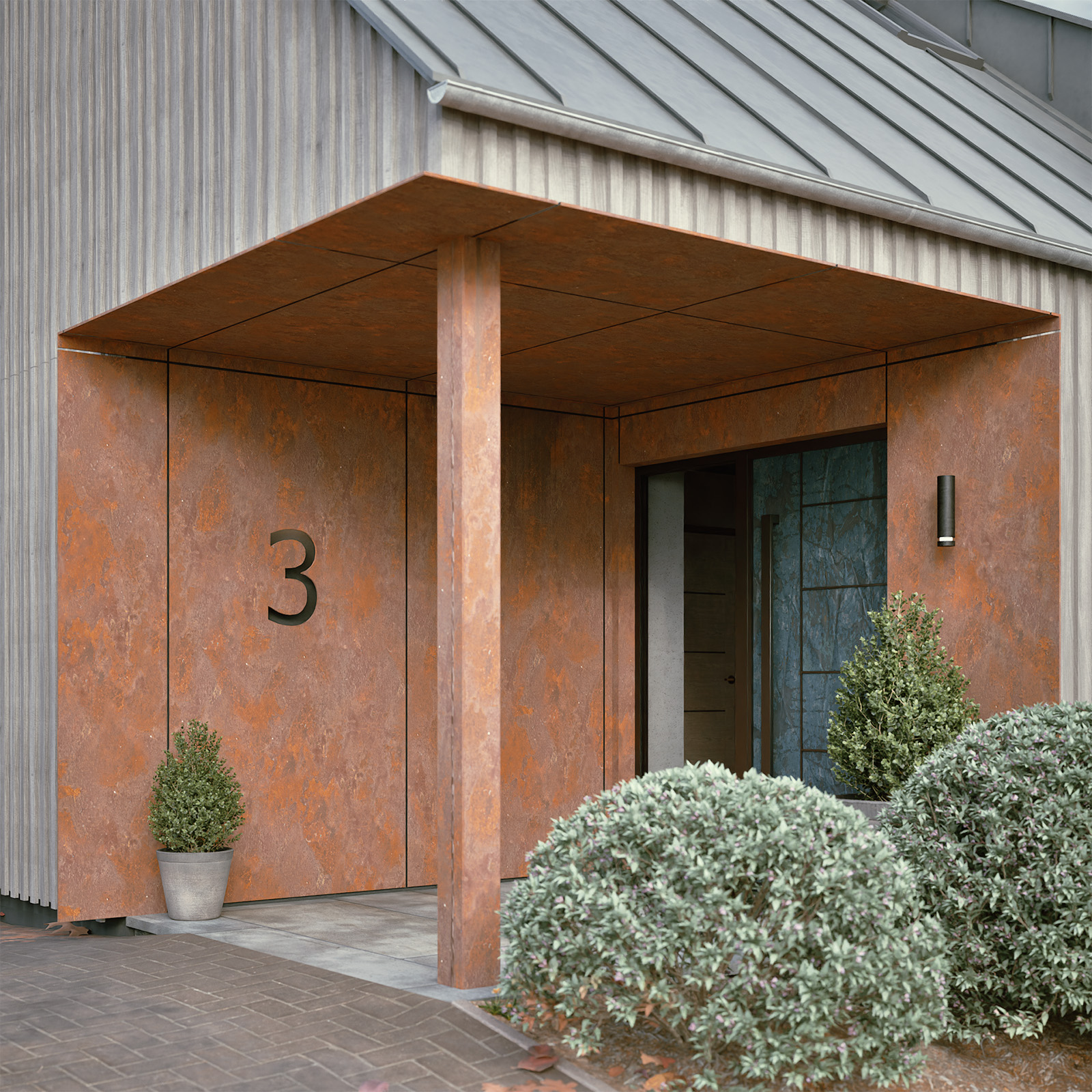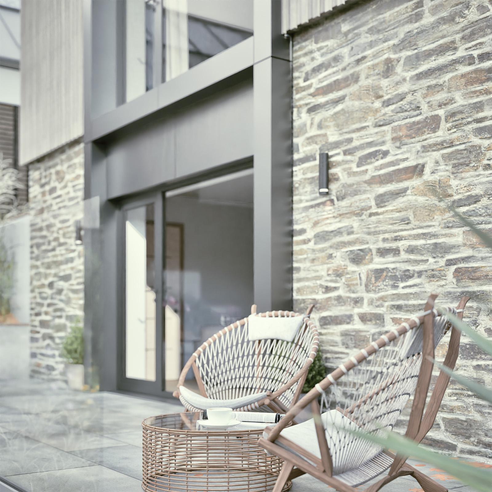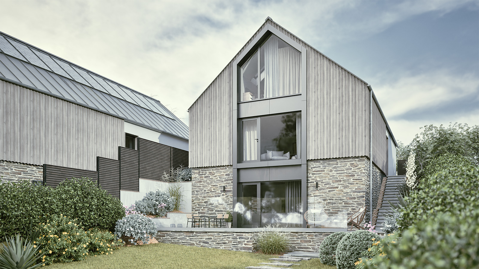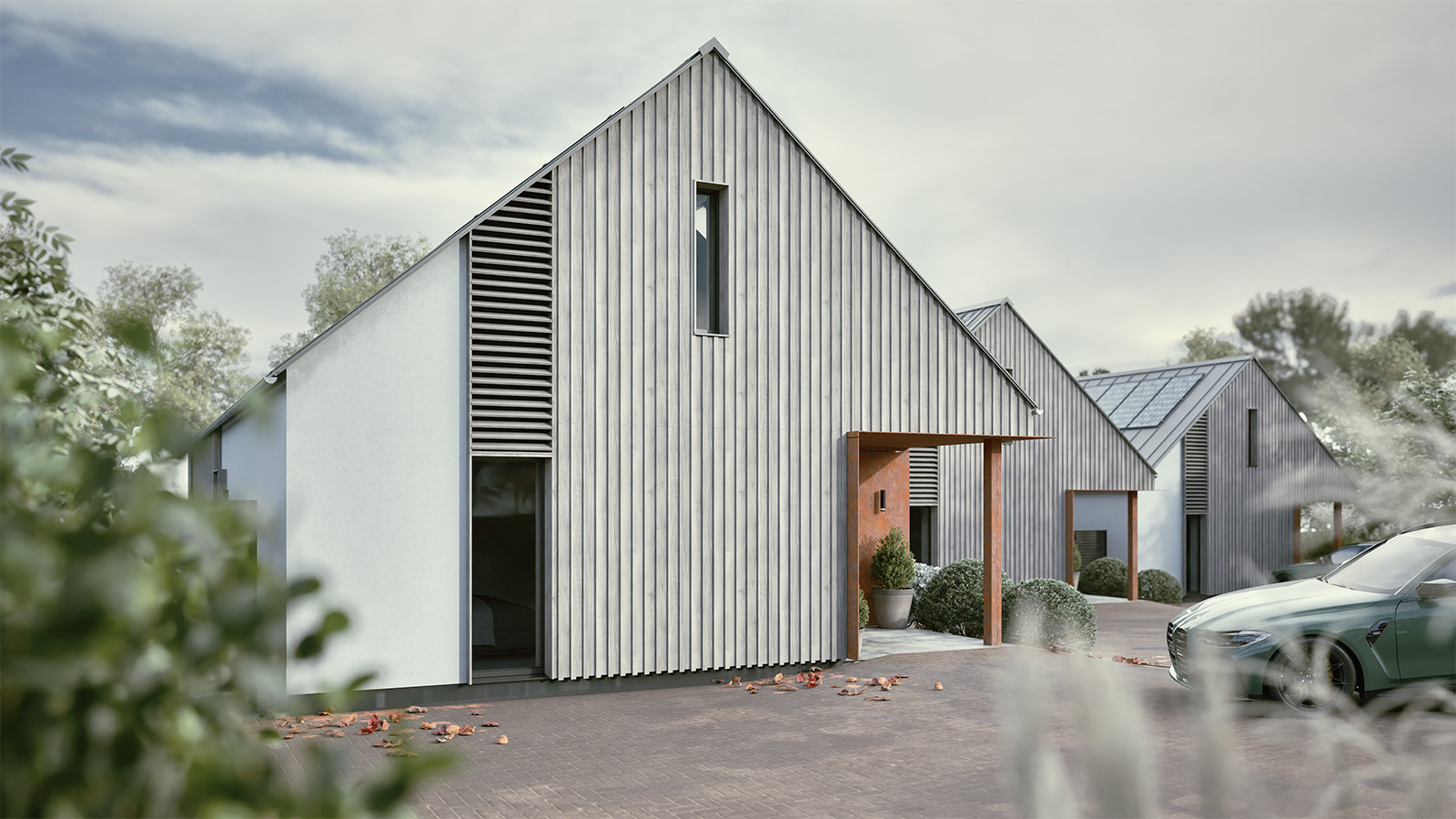 Natural materials, including stone, timber cladding, and slate, give the buildings a timeless quality, while feature elements such as corten steel at the entrance provide a distinctive contemporary edge.