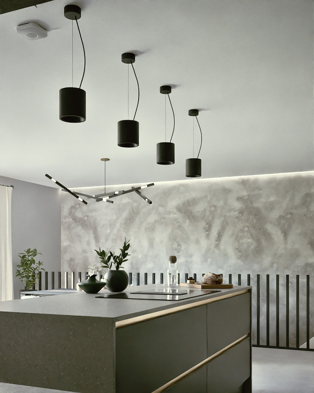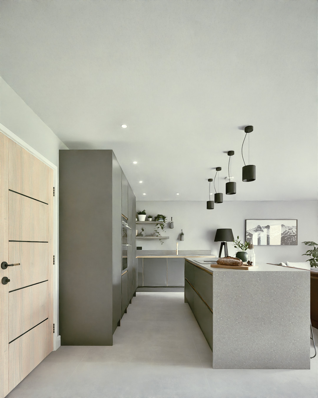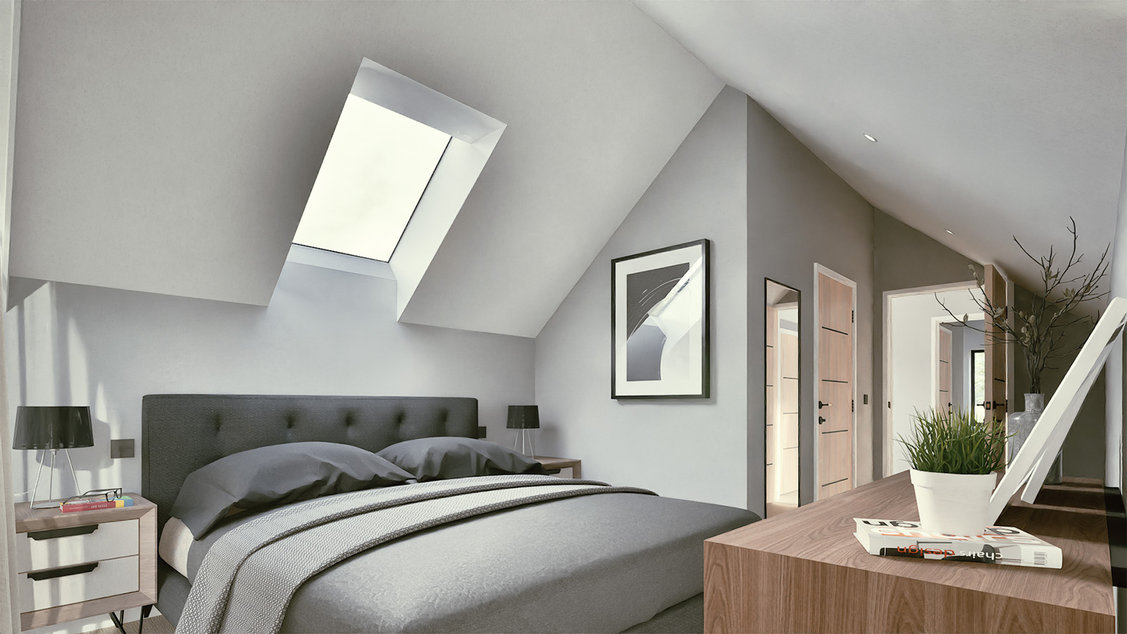 Three bedrooms are distributed across the two levels—one at entrance level and two below—with en-suites, a family bathroom, and a guest WC. Practical details such as a utility room within the garage link are seamlessly integrated without disrupting the flow of the main spaces.