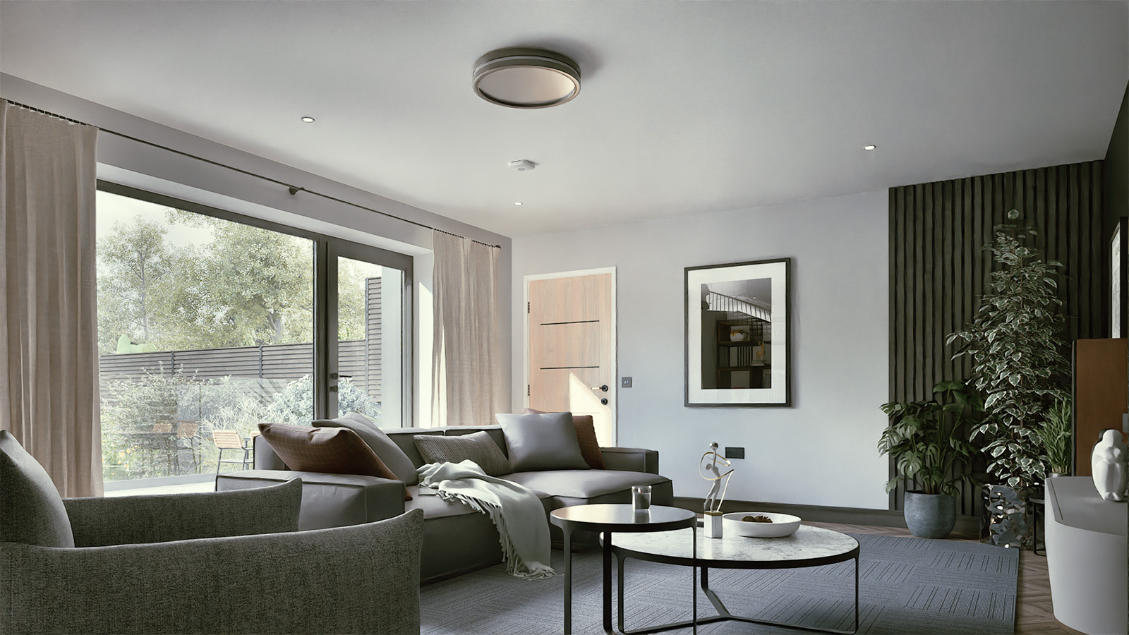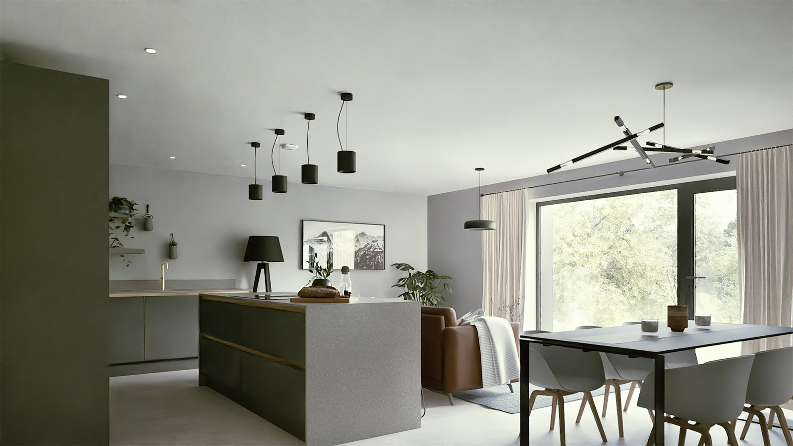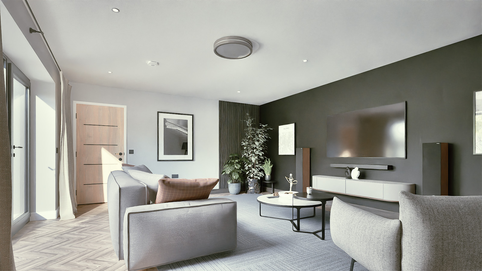 The rear of each house opens to an expansive kitchen, dining, and living space, with large glazing and a balcony that extend out to landscaped gardens. On the lower ground floor, a snug connects directly to the outdoors, offering a more intimate space for family life and entertaining.