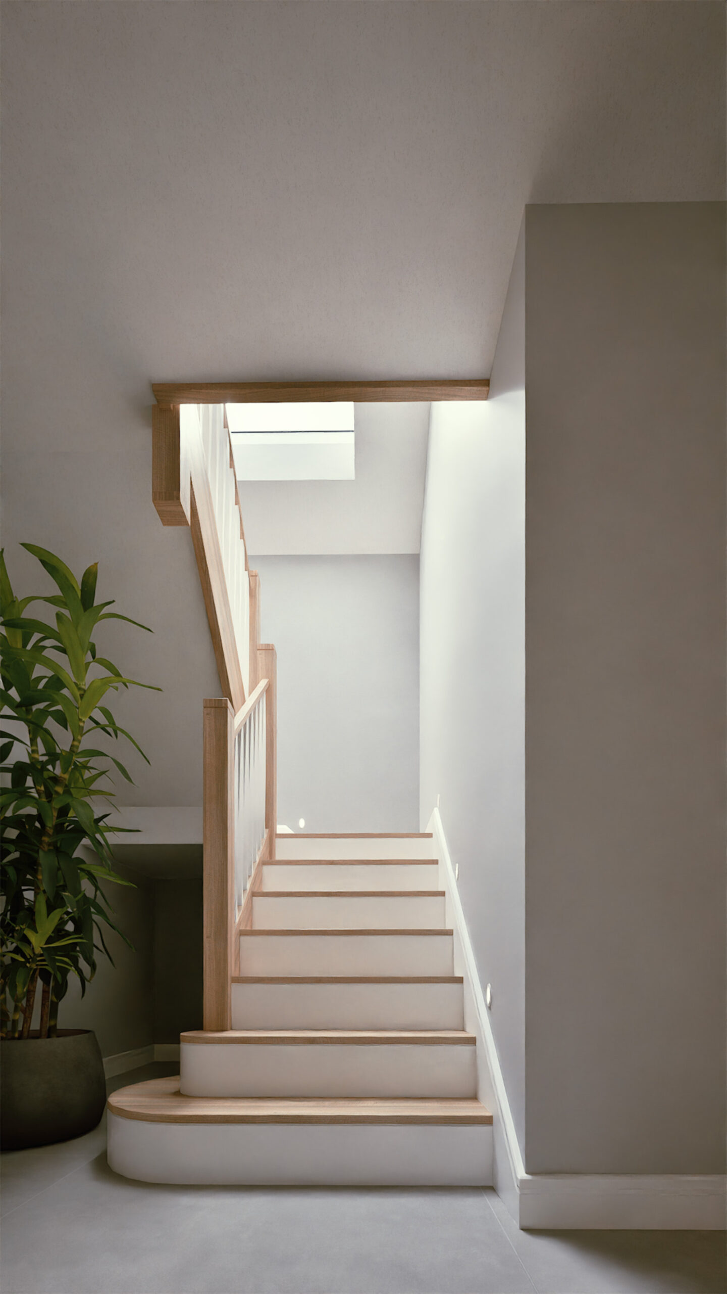 Living spaces are arranged across two levels to maximise views over the surrounding woodland. At the entrance, a clear line of sight draws you through the home and out to the landscape beyond, while circulation spaces are kept open and light-filled to create a sense of calm.